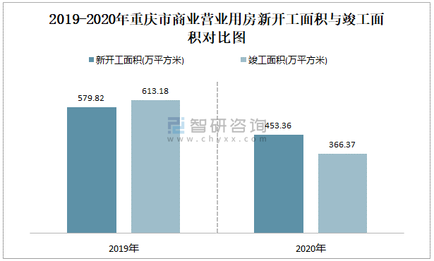 2019-2020年重慶市商業營業用房新開工面積與竣工面積對比圖