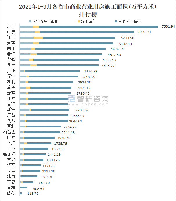 2021年1-9月各省市商業營業用房施工面積(萬平方米)排行榜
