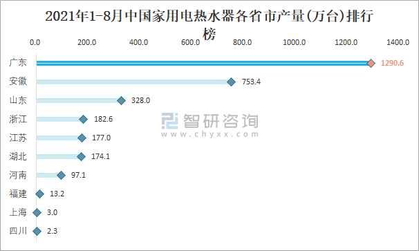 2021年1-8月中國家用電熱水器各省市產(chǎn)量排行榜
