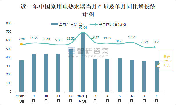 根據(jù)國家統(tǒng)計局數(shù)據(jù)顯示:2021年8月中國家用電熱水器產(chǎn)量為362萬臺,同比下降3.29%;2021年1-8月中國家用電熱水器累計產(chǎn)量為3021.5萬臺,同比增長15.01%;2015-2020年中國家用電熱水器產(chǎn)量2019年達到最高,次年大幅度下滑。