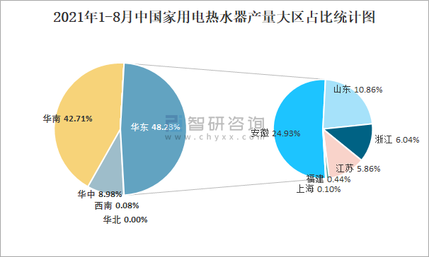 2021年1-8月中國家用電熱水器產(chǎn)量大區(qū)占比統(tǒng)計圖