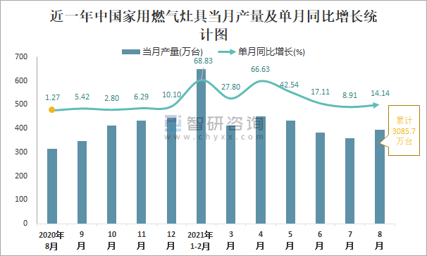 近一年中國(guó)家用燃?xì)庠町?dāng)月產(chǎn)量及單月同比增長(zhǎng)統(tǒng)計(jì)圖
