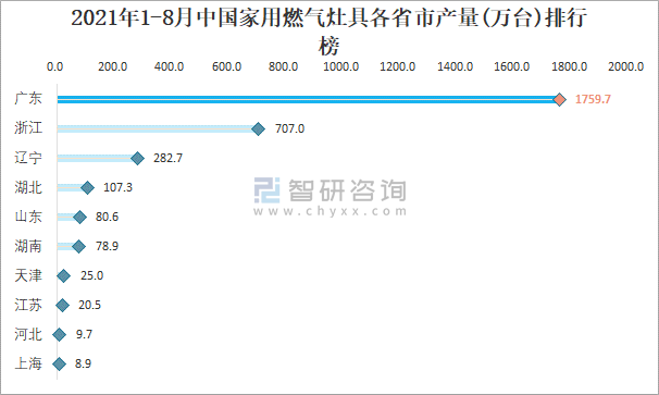 2021年1-8月中國(guó)家用燃?xì)庠罡魇∈挟a(chǎn)量排行榜