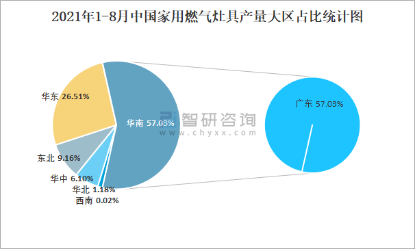 2021年1-8月中國(guó)家用燃?xì)庠町a(chǎn)量大區(qū)占比統(tǒng)計(jì)圖