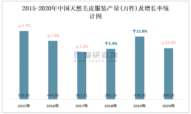 2015-2020年中國天然毛皮服裝產量及增長率統計圖