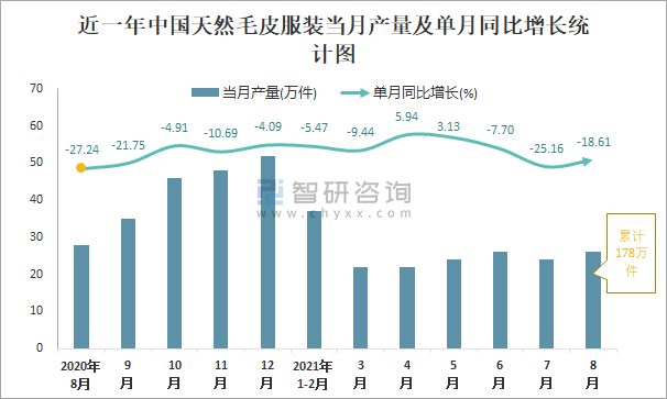 根據國家統計局數據顯示:2021年8月中國天然毛皮服裝產量為26萬件,同比下降18.61%;2021年1-8月中國天然毛皮服裝累計產量為178萬件,同比下降9.8%;2015-2020年中國天然毛皮服裝產量2017年跌至最低,此后總體呈現上升趨勢。