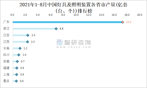 2021年1-8月中國燈具及照明設置各省市產量排行榜