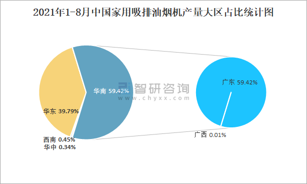 2021年1-8月中國家用吸排油煙機(jī)產(chǎn)量大區(qū)占比統(tǒng)計(jì)圖