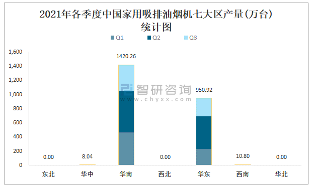 2021年各季度中國家用吸排油煙機(jī)七大區(qū)產(chǎn)量統(tǒng)計(jì)圖