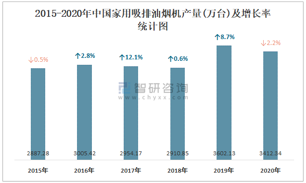 2015-2020年中國家用吸排油煙機(jī)產(chǎn)量及增長率統(tǒng)計(jì)圖
