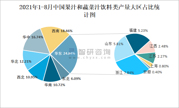 2021年1-8月中國果汁和蔬菜汁飲料類產(chǎn)量大區(qū)占比統(tǒng)計圖