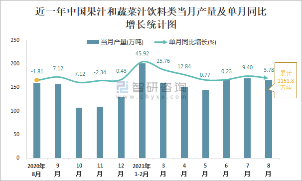 根據(jù)國家統(tǒng)計局數(shù)據(jù)顯示:2021年8月中國果汁和蔬菜汁飲料類產(chǎn)量為166萬噸,同比增長3.78%;2021年1-8月中國果汁和蔬菜汁飲料類累計產(chǎn)量為1161.8萬噸,同比增長13.17%;2015-2020年中國果汁和蔬菜汁飲料類產(chǎn)量2016年達到最高,此后總體呈現(xiàn)下降趨勢。