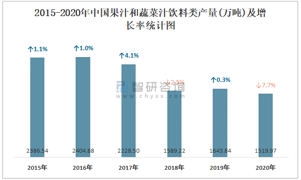 2015-2020年中國果汁和蔬菜汁飲料類產(chǎn)量及增長率統(tǒng)計圖