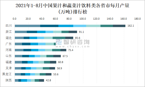 2021年1-8月中國果汁和蔬菜汁飲料類各省市每月產(chǎn)量排行榜