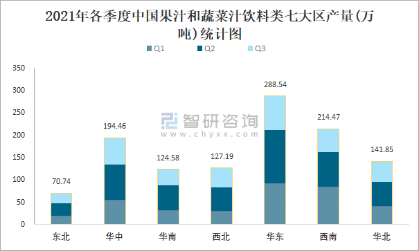 2021年各季度中國果汁和蔬菜汁飲料類七大區(qū)產(chǎn)量統(tǒng)計圖