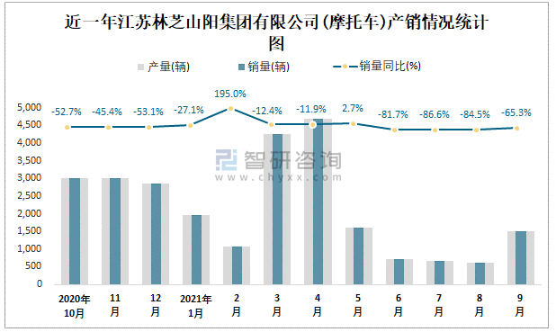 根據中國汽車工業(摩托車)產銷快訊數據顯示:2021年9月江蘇林芝山陽集團有限公司(摩托車)產量為1501輛,同比下降65.33%,銷量為1501輛,同比下降65.33%;2021年1-9月江蘇林芝山陽集團有限公司(摩托車)累計產量為17072輛,同比下降52.41%,累計銷量為17072輛,同比下降52.41%;2016-2020年江蘇林芝山陽集團有限公司(摩托車)產銷量2019年達到最高值,此后有所下滑,且近5年總銷量等于總產量,無積壓庫存,庫存管理良好,出口量偏少,銷量以內銷為主。