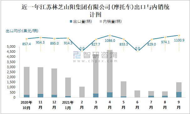 根據中國汽車工業(摩托車)產銷快訊數據統計可知:近一年江蘇林芝山陽集團有限公司(摩托車)出口量偏少,銷量以內銷為主,總出口量占比總銷量的11.6%,出口均價9月達到最高值,其中9月出口量為540輛,出口均價約為1100.93美元/輛;2021年1-9月江蘇林芝山陽集團有限公司(摩托車)累計出口量為2092輛,同比下降21.91%,累計出口金額約為204.94萬美元,同比下降23.13%。