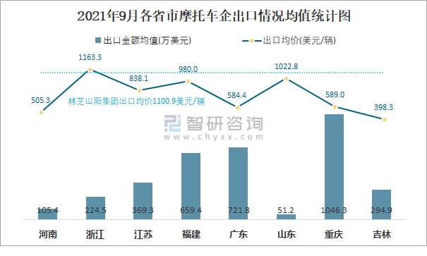 2021年9月各省市摩托車企出口情況均值統計圖