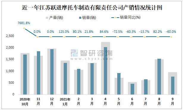 近一年江蘇躍進摩托車制造有限責任公司產銷情況統計圖