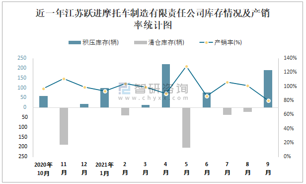 根據中國汽車工業(摩托車)產銷快訊數據統計可知:近一年江蘇躍進摩托車制造有限責任公司(摩托車)共積壓庫存182輛,其產銷率存在一定幅度波動,5月產銷率最高(128.59%),清倉庫存203輛,9月產銷率偏低(80%),積壓庫存190輛;近一年江蘇躍進摩托車制造有限責任公司(摩托車)暫未出口,全部依靠內銷。