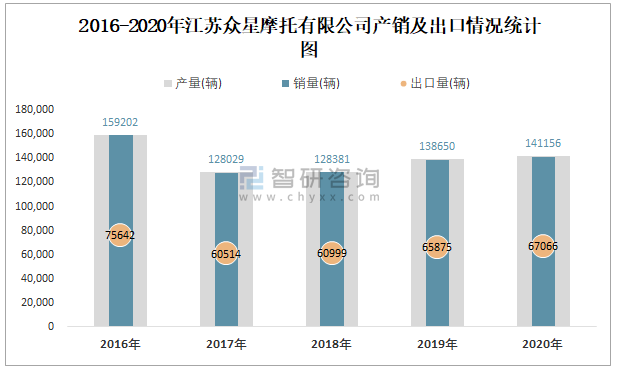 2016-2020年江蘇眾星摩托有限公司產銷及出口情況統計圖