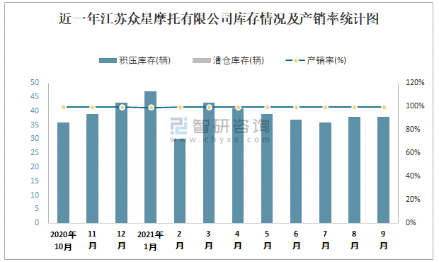 近一年江蘇眾星摩托有限公司庫存情況及產銷率統計圖