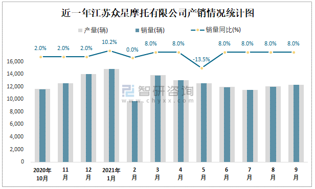 近一年江蘇眾星摩托有限公司產銷情況統計圖