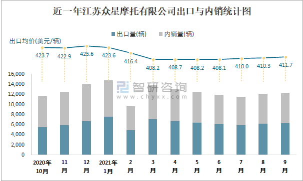 根據中國汽車工業(摩托車)產銷快訊數據統計可知:近一年江蘇眾星摩托有限公司(摩托車)共積壓庫存467輛,其產銷率波動幅度較小,2020年12月產銷率最高(99.69%),清倉庫存43輛,1月產銷率偏低(99.68%),積壓庫存47輛;近一年江蘇眾星摩托有限公司(摩托車)總出口量占比總銷量的50.3%,出口均價6月起逐月遞增,其中9月出口量為6298輛,出口均價約為411.73美元/輛;2021年1-9月江蘇眾星摩托有限公司(摩托車)累計出口量為57235輛,同比增長16.94%,累計出口金額約為2357.03萬美元,同比增長14.21%。