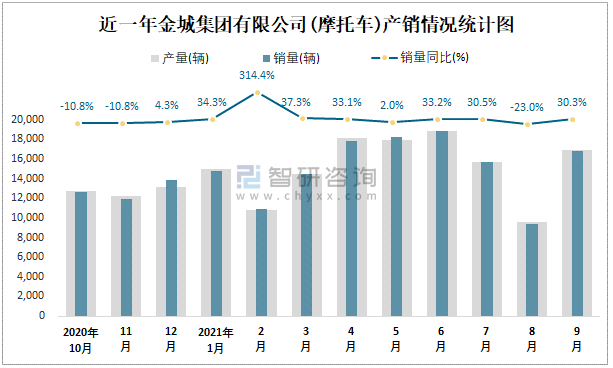 根據中國汽車工業(摩托車)產銷快訊數據顯示:2021年9月金城集團有限公司(摩托車)產量為16888輛,同比增長29.98%,銷量為16858輛,同比增長30.34%;2021年1-9月金城集團有限公司(摩托車)累計產量為137218輛,同比增長23.74%,累計銷量為137018輛,同比增長24.34%;2016-2020年金城集團有限公司(摩托車)產銷量2017年達到最高值,此后總體呈現下降趨勢,且近5年總銷量大于總產量,清倉庫存7130輛,出口量逐年遞增。
