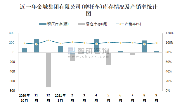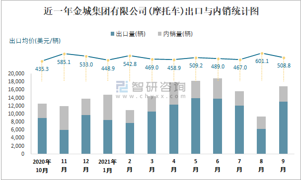 根據中國汽車工業(摩托車)產銷快訊數據統計可知:近一年金城集團有限公司(摩托車)共清倉庫存164輛,其產銷率存在一定幅度波動,2020年12月產銷率最高(105.55%),清倉庫存728輛,8月產銷率偏低(97.42%),積壓庫存247輛;近一年金城集團有限公司(摩托車)總體銷量以出口為主,總出口量占比總銷量的70.2%,出口均價8月達到最高值,此后有所下滑,其中9月出口量為13049輛,出口均價約為508.84美元/輛;2021年1-9月金城集團有限公司(摩托車)累計出口量為98221輛,同比增長56.24%,累計出口金額約為4833.4萬美元,同比增長65.48%。
