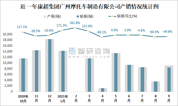 近一年康超集團廣州摩托車制造有限公司產(chǎn)銷情況統(tǒng)計圖