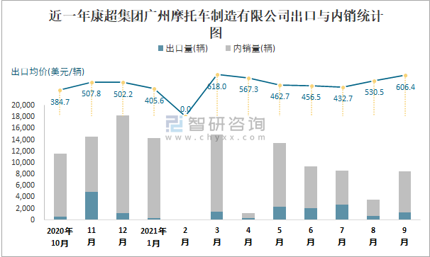 根據(jù)中國汽車工業(yè)(摩托車)產(chǎn)銷快訊數(shù)據(jù)統(tǒng)計可知:近一年康超集團廣州摩托車制造有限公司(摩托車)共積壓庫存685輛,其產(chǎn)銷率存在一定幅度波動,7月產(chǎn)銷率最高(100.04%),清倉庫存3輛,9月產(chǎn)銷率偏低(92.52%),積壓庫存686輛;近一年康超集團廣州摩托車制造有限公司(摩托車)出口量偏少,銷量以內(nèi)銷為主,總出口量占比總銷量的15.4%,出口均價7月起逐月遞增,其中9月出口量為1297輛,出口均價約為606.4美元/輛;2021年1-9月康超集團廣州摩托車制造有限公司(摩托車)累計出口量為11379輛,同比下降25.33%,累計出口金額約為564.63萬美元,同比下降18.69%。