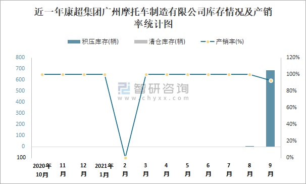 近一年康超集團廣州摩托車制造有限公司庫存情況及產(chǎn)銷率統(tǒng)計圖