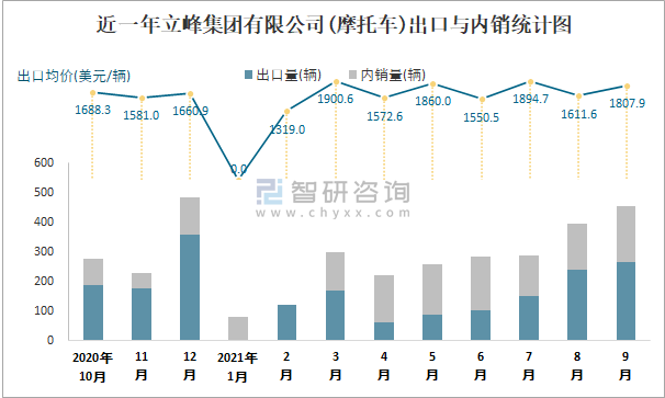 根據中國汽車工業(摩托車)產銷快訊數據統計可知:近一年立峰集團有限公司(摩托車)共清倉庫存109輛,其產銷率存在一定幅度波動,2020年12月產銷率最高(208.15%),清倉庫存252輛,1月產銷率偏低(38.21%),積壓庫存131輛;近一年立峰集團有限公司(摩托車)銷量以出口為主,總出口量占比總銷量的56.8%,出口均價3月達到最高值,此后存在一定幅度波動,其中9月出口量為265輛,出口均價約為1807.92美元/輛;2021年1-9月立峰集團有限公司(摩托車)累計出口量為1203輛,同比增長25.05%,累計出口金額約為206.06萬美元,同比增長36.29%。