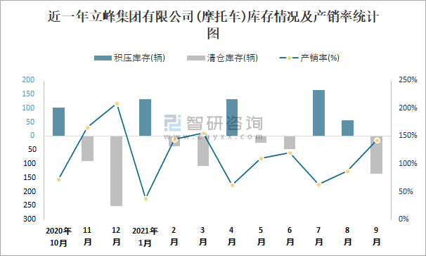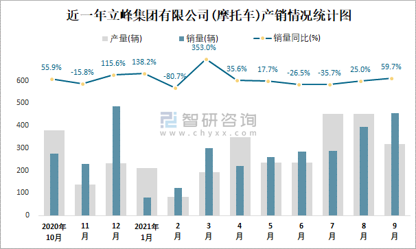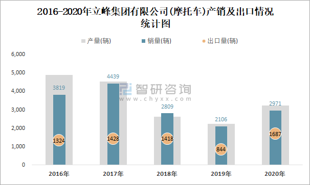根據中國汽車工業(摩托車)產銷快訊數據顯示:2021年9月立峰集團有限公司(摩托車)產量為319輛,同比下降18.62%,銷量為455輛,同比增長59.65%;2021年1-9月立峰集團有限公司(摩托車)累計產量為2533輛,同比增長1.89%,累計銷量為2402輛,同比增長21.31%;2016-2020年立峰集團有限公司(摩托車)產銷量2019年跌至最低值,此后有所回升,且近5年總產量大于總銷量,積壓了庫存1381輛,2020年出口量占比增加。