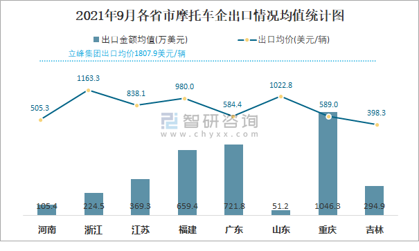 根據中國汽車工業(摩托車)產銷快訊與企查查數據統計可知:2021年9月92家車企摩托車銷量為1681888輛,出口總金額約為45710.77萬美元(其中有兩家子公司,其數據已包含在母公司中,不參加行業匯總);2021年9月92家車企擁有20年以上企業年齡的銷量最高,從企業資本性質來看,銷量占比最大的為內資企業(部分上市公司股份不明確的企業未統計在內),從企業人員規模來看,擁有1000-9999人員規模的車企銷量占比最大,非上市公司銷量占比最高。92家車企主要分布在10個省(市),其中廣東車企最多(26個),部分省市車企不出口,從出口金額均值來看,重慶車企(18家企業)出口金額均值最高,立峰集團有限公司約為1807.9美元/輛,高于浙江出口均價。