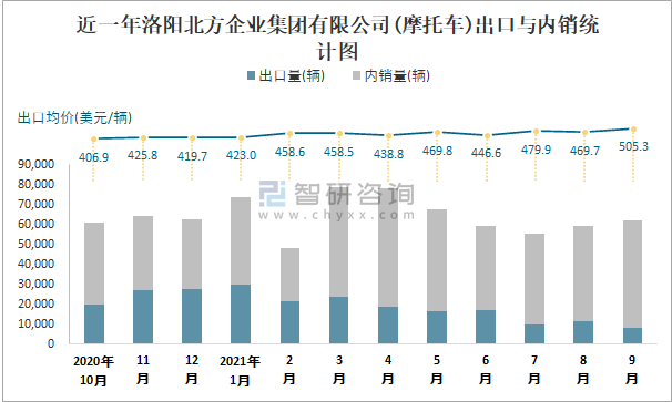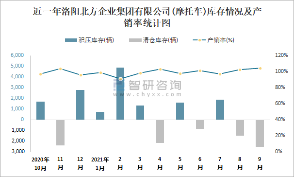 根據中國汽車工業(摩托車)產銷快訊數據統計可知:近一年洛陽北方企業集團有限公司(摩托車)共積壓庫存5389輛,其產銷率存在一定幅度波動,9月產銷率最高(104.27%),清倉庫存2551輛,2月產銷率偏低(90.84%),積壓庫存4860輛;近一年洛陽北方企業集團有限公司(摩托車)出口量偏少,銷量以內銷為主,總出口量占比總銷量的30.1%,出口均價9月達到最高值,其中9月出口量為8342輛,出口均價約為505.27美元/輛;2021年1-9月洛陽北方企業集團有限公司(摩托車)累計出口量為157715輛,同比下降2.87%,累計出口金額約為7160.94萬美元,同比增長9.55%。