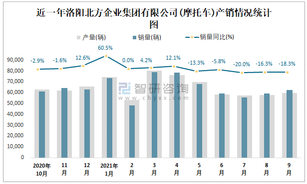 根據中國汽車工業(摩托車)產銷快訊數據顯示:2021年9月洛陽北方企業集團有限公司(摩托車)產量為59748輛,同比下降22.21%,銷量為62299輛,同比下降18.29%;2021年1-9月洛陽北方企業集團有限公司(摩托車)累計產量為586562輛,同比增長8.64%,累計銷量為583268輛,同比增長8.17%;2016-2020年洛陽北方企業集團有限公司(摩托車)產銷量相對平穩,漲跌幅度相對較小,且近5年總銷量大于總產量,清倉庫存3128輛,出口量偏少,銷量以內銷為主。