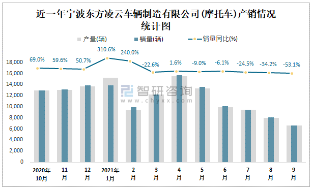 根據(jù)中國汽車工業(yè)(摩托車)產(chǎn)銷快訊數(shù)據(jù)顯示:2021年9月寧波東方凌云車輛制造有限公司(摩托車)產(chǎn)量為6565輛,同比下降53.18%,銷量為6643輛,同比下降53.11%;2021年1-9月寧波東方凌云車輛制造有限公司(摩托車)累計產(chǎn)量為99556輛,同比增長3.78%,累計銷量為99394輛,同比增長4.03%;2016-2020年寧波東方凌云車輛制造有限公司(摩托車)產(chǎn)銷量2019年跌至最低值,此后有所回升,且近5年總產(chǎn)量大于總銷量,積壓了庫存745輛,出口量偏少,銷量以內(nèi)銷為主。