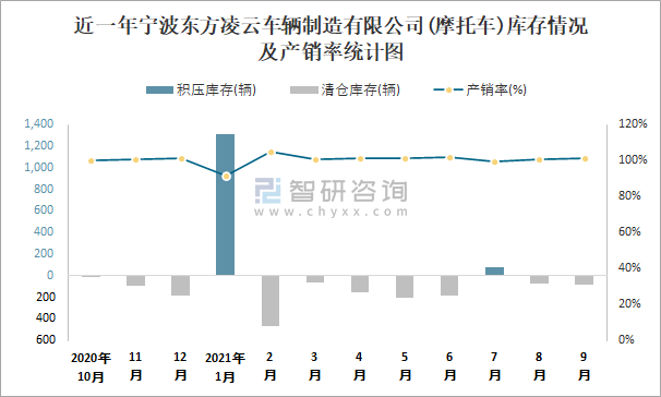 近一年寧波東方凌云車輛制造有限公司庫存情況及產(chǎn)銷率統(tǒng)計圖