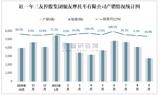 根據中國汽車工業(摩托車)產銷快訊數據顯示:2021年9月三友控股集團銀友摩托車有限公司(摩托車)產量為2745輛,同比下降36.82%,銷量為2745輛,同比下降36.82%;2021年1-9月三友控股集團銀友摩托車有限公司(摩托車)累計產量為36657輛,同比增長41.98%,累計銷量為36657輛,同比增長41.98%;2016-2020年三友控股集團銀友摩托車有限公司(摩托車)產銷量總體呈現上升趨勢,且近5年總銷量等于總產量,無積壓庫存,庫存管理良好,總體銷量以出口為主。