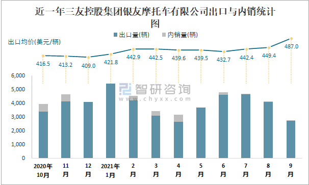 根據中國汽車工業(摩托車)產銷快訊數據統計可知:近一年三友控股集團銀友摩托車有限公司(摩托車)總體銷量以出口為主,總出口量占比總銷量的95%,出口均價6月起逐月遞增,其中9月出口量為2718輛,出口均價約為487.05美元/輛;2021年1-9月三友控股集團銀友摩托車有限公司(摩托車)累計出口量為35252輛,同比增長38%,累計出口金額約為1557.29萬美元,同比增長46.24%。