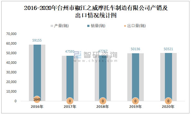 2016-2020年臺州市椒江之威摩托車制造有限公司產(chǎn)銷及出口情況統(tǒng)計圖