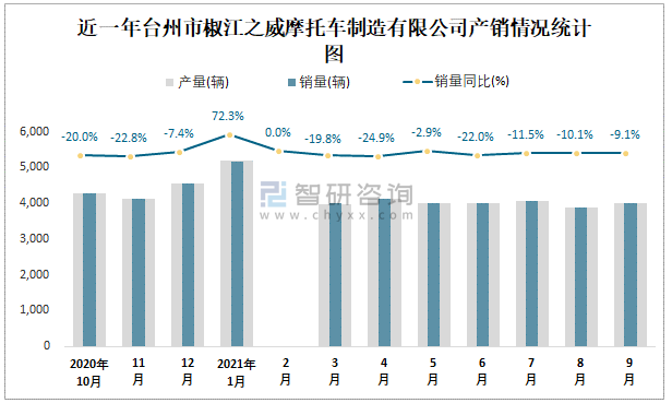 根據(jù)中國汽車工業(yè)(摩托車)產(chǎn)銷快訊數(shù)據(jù)顯示:2021年9月臺州市椒江之威摩托車制造有限公司(摩托車)產(chǎn)量為4018輛,同比下降8.85%,銷量為4016輛,同比下降9.14%;2021年1-9月臺州市椒江之威摩托車制造有限公司(摩托車)累計產(chǎn)量為33270輛,同比下降10.88%,累計銷量為33269輛,同比下降10.9%;2016-2020年臺州市椒江之威摩托車制造有限公司(摩托車)產(chǎn)銷量2017年跌至最低值,此后逐年遞增,且近5年總銷量大于總產(chǎn)量,清倉庫存26輛,出口量偏少,銷量以內(nèi)銷為主。