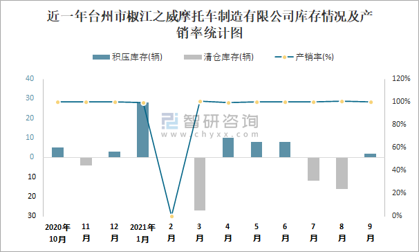 近一年臺州市椒江之威摩托車制造有限公司庫存情況及產(chǎn)銷率統(tǒng)計圖