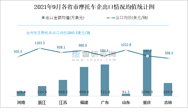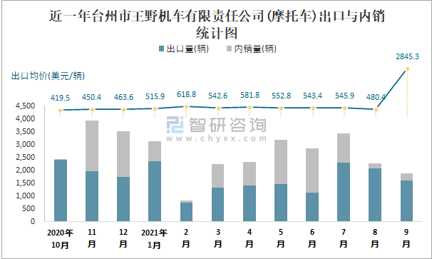 根據中國汽車工業(摩托車)產銷快訊數據統計可知:近一年臺州市王野機車有限責任公司(摩托車)銷量以出口為主,總出口量占比總銷量的64.1%,出口均價9月達到最高值,其中9月出口量為1615輛,出口均價約為2845.33美元/輛;2021年1-9月臺州市王野機車有限責任公司(摩托車)累計出口量為14430輛,同比增長21.4%,累計出口金額約為1149.19萬美元,同比增長113.31%。