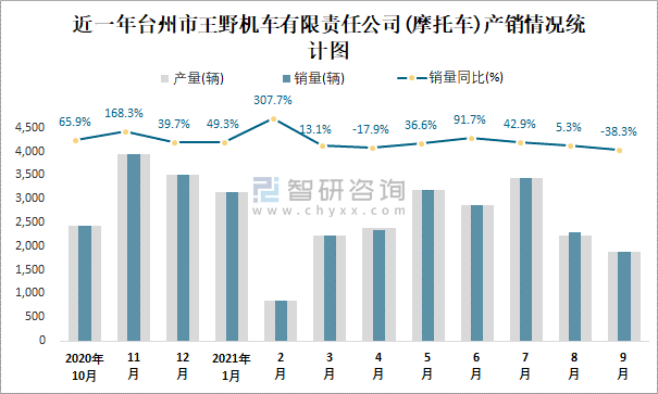 近一年臺州市王野機車有限責任公司產銷情況統計圖