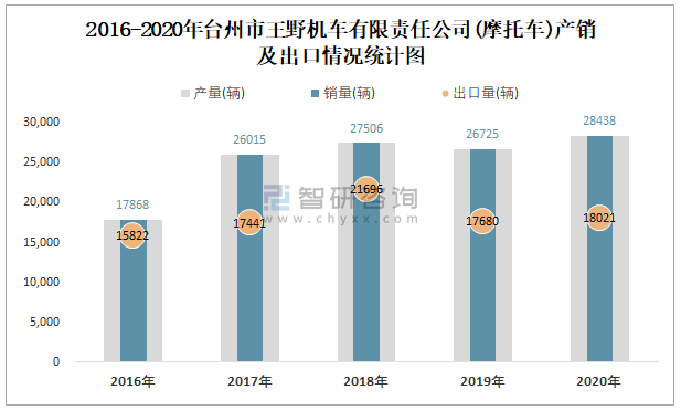 2016-2020年臺州市王野機車有限責任公司產銷及出口情況統計圖
