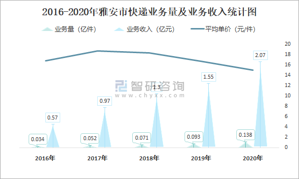 2016-2020年雅安市快遞業務量及業務收入統計圖