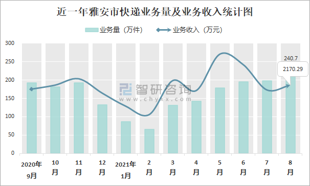 近一年雅安市快遞業務量及業務收入統計圖